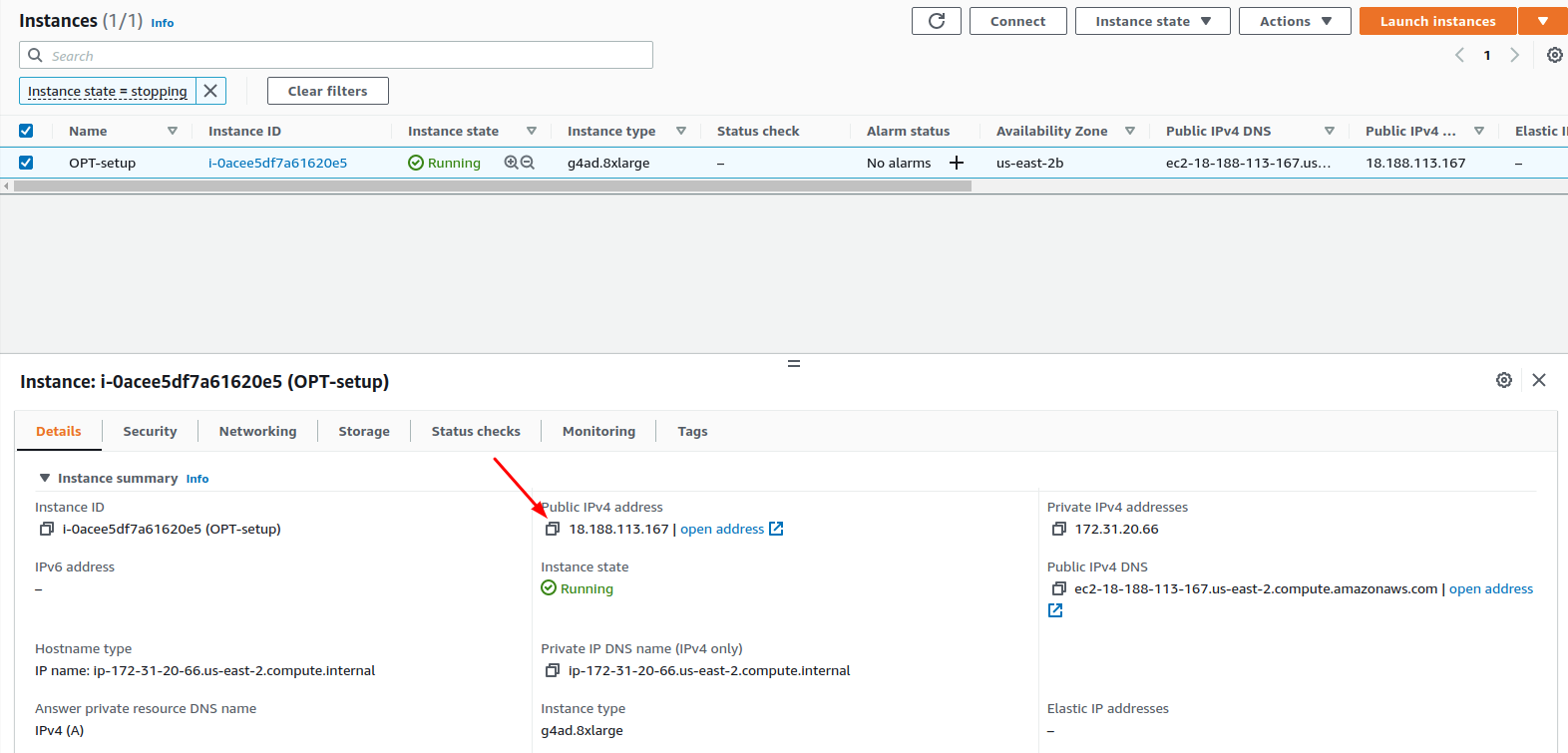 You can see more details about your instance by clicking on the Instance ID. A public IPv4 address can be used to connect your instance.