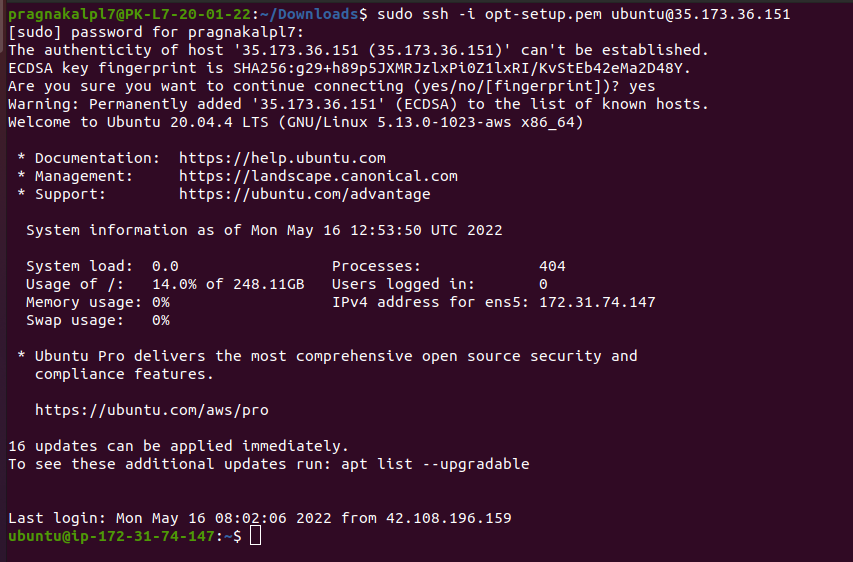Open your terminal and change the directory with the command cd, where you downloaded your pem file. Copy the below command on your terminal with your .pem file name and IP address which is copied from instance details as shown in the above image.